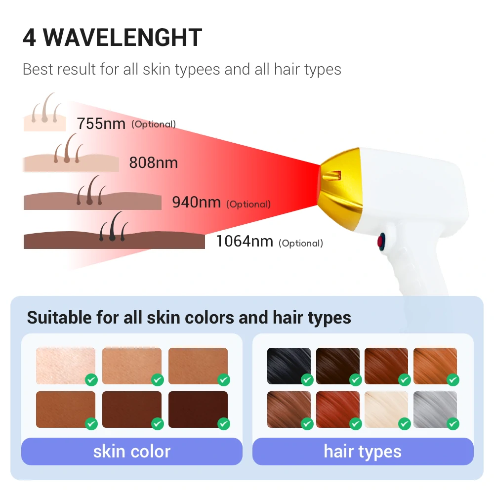 - Multiple Wavelength Options: Offers 755nm, 808nm, 940nm, and 1064nm options, suitable for various skin tones and hair types, ensuring optimal results.